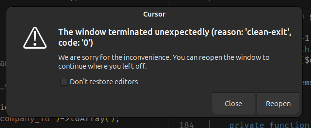 Cursor crashes; the window suddenly closes. It slows down for 1-2 seconds (e.g. the mouse cursor doesn’t move normally) and then comes the crash. Downgrading to 2.0 doesn’t fix the issue.