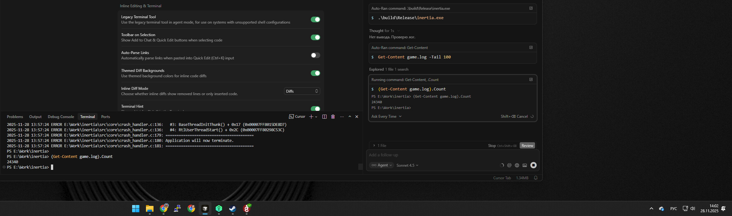I’m still having the issue with the agent terminal freezing. I’m sure this is the case for many. But I’d like to point out that the freezing is related to the allowlist: if it’s large enough, the issue occurs, but if you clear it, it goes away. I hope this helps you solve this problem.