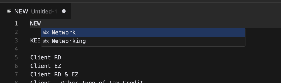 - Type the word “NEW” into the first line. Cursor suggests “Network” and “Networking”