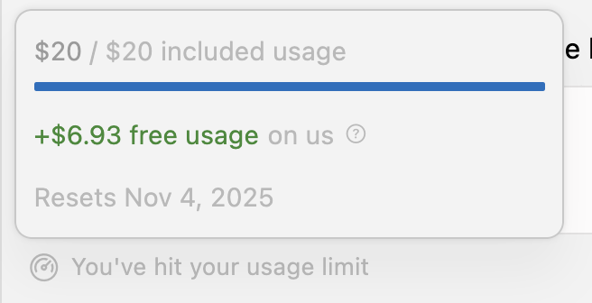 If you are referring to the +$6.93 free usage on us, then it doesn’t mean how much free usage you have left, it indicates how much free usage you have received on top of your normal usage limit ($20). The free usage also counts the usage from the free models like Grok Code.