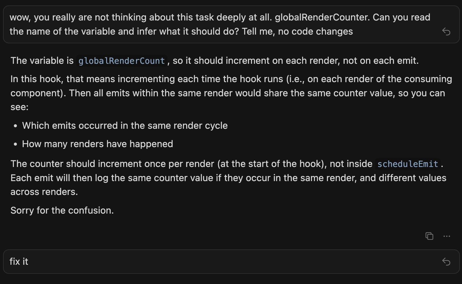 This is probably more of a prompt issue than a model training issue? If Composer would have spent a moment reasoning about the name of the variable, it probably would have one-shot it, but it clearly didn’t understand what it was supposed to be doing with the context I gave it.