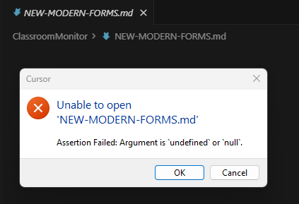 Markdown files that are created or modified using Cursor’s AI assistant tools (write and search_replace) become unrenderable in Cursor’s markdown preview pane, showing an “Assertion Failed: Argument is undefined or null” error. The files remain valid markdown and can be opened in the raw markdown editor.
