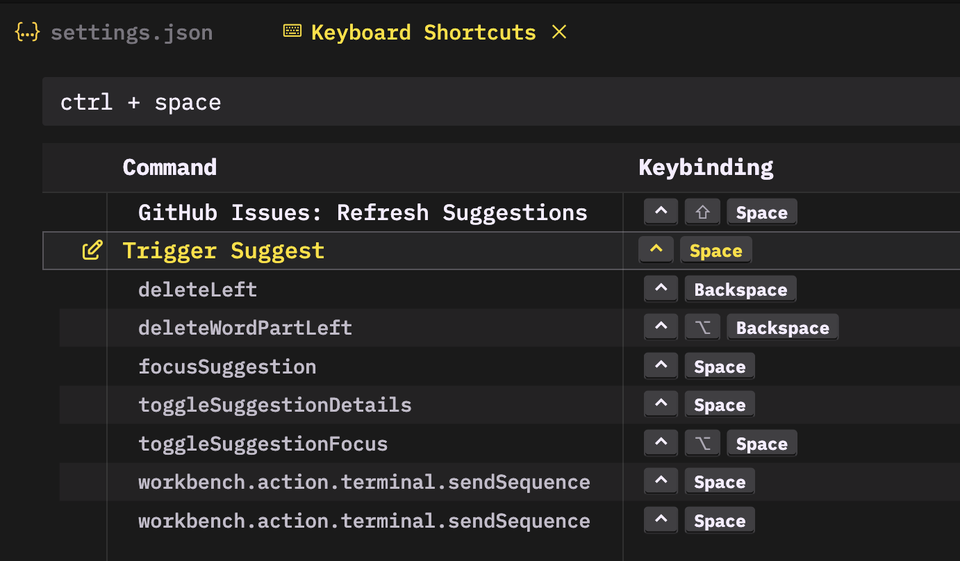 The problem I’m facing is that the usual ctrl+space for seeing the suggestions from vscode (the toggleSuggesionDetails) doesn’t work even if the keyboard binding is correctly set. I mean that by using ctrl+space nothing happens. I still manage to see it because sometimes it opens automatically when i write a .