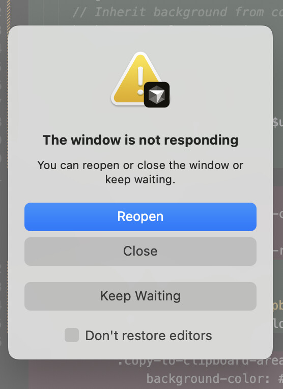 After opening my project (React), Cursor becomes almost completely unresponsive within ~30–60 seconds. The UI freezes, typing lags heavily, and eventually macOS shows the “The window is not responding” dialog.