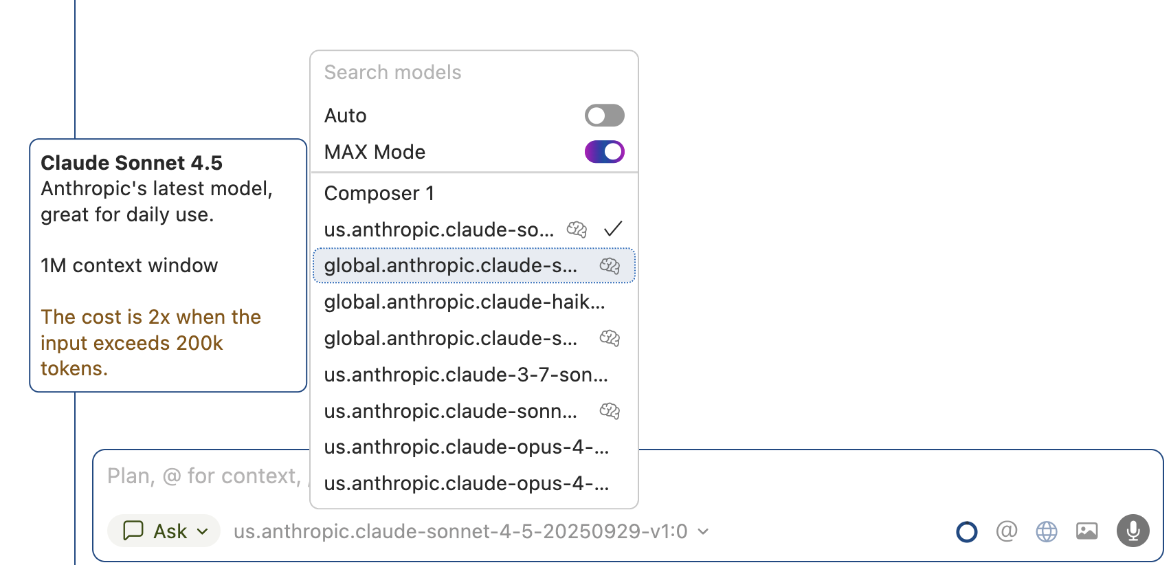 Severity: High - this behavior is leading to substantial unexpected billing (hundreds of dollars per day) and makes Cursor unusable under AWS Bedrock quotas for the 1M context model.