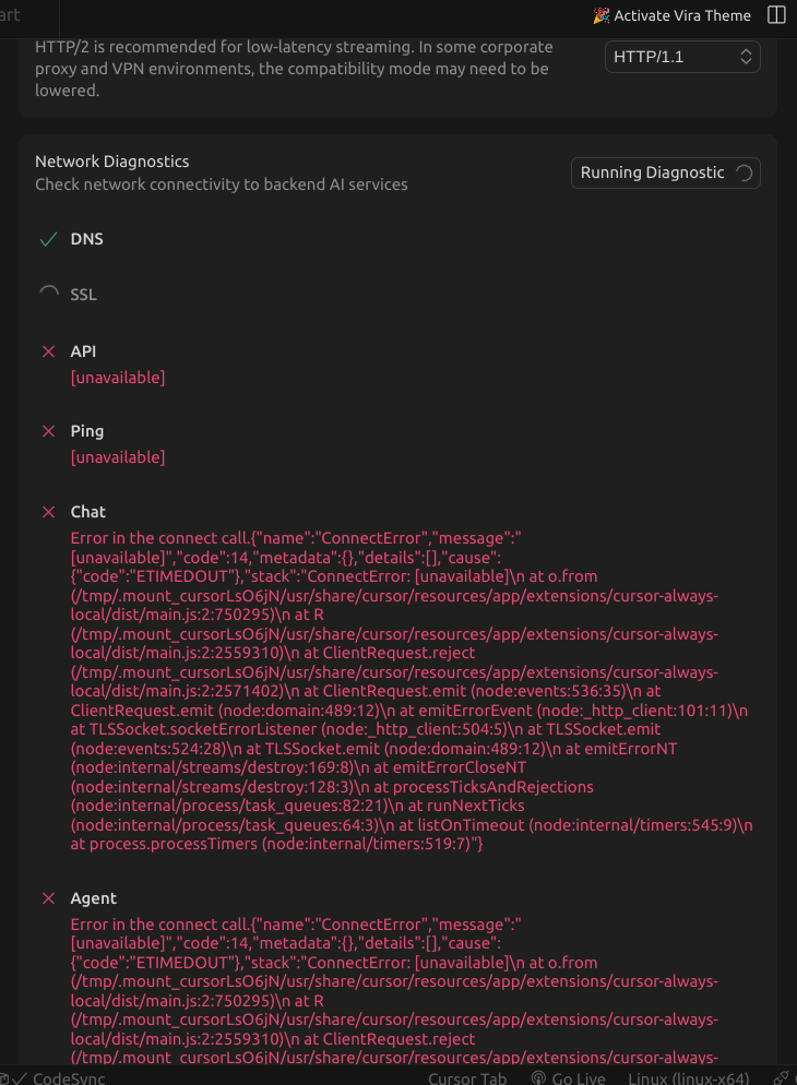 Hey, thanks for the report. I can see HTTP/1.1 is enabled, but you’re getting ETIMEDOUT errors — this means connections to Cursor’s backend services are being blocked at the network level before they complete.