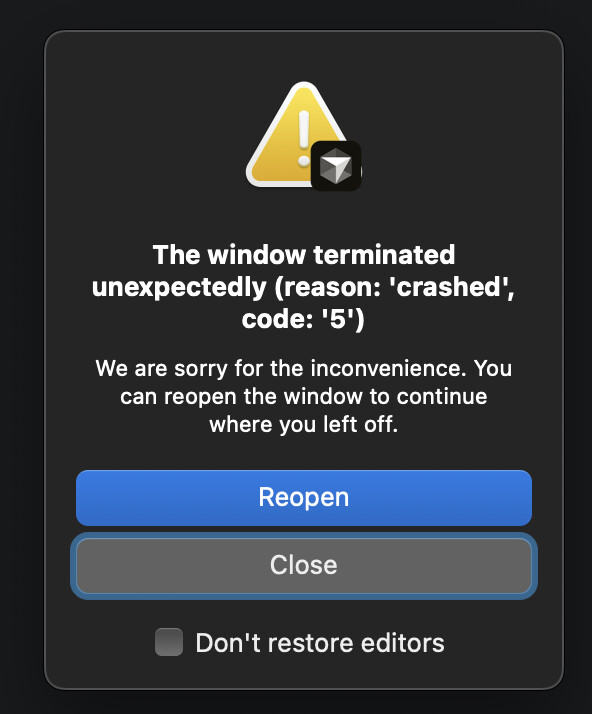 For the last couple days around 70-80% of the time when I initiate a prompt in editor Cursor crashes in the middle of prompt response. Anyone experience this before? Screenshot of crash dialog box below. When restarting Cursor sometimes the editor just spins after I enter a prompt and never proceeds. Usually takes me another force quit on app and reopen until its usable again.