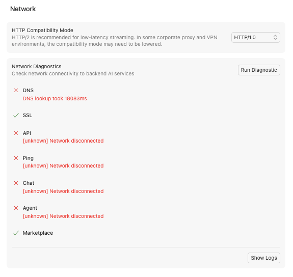 Run Network Diagnostics: Cursor Settings → Network → Run Diagnostics and share the results. Is it all green?