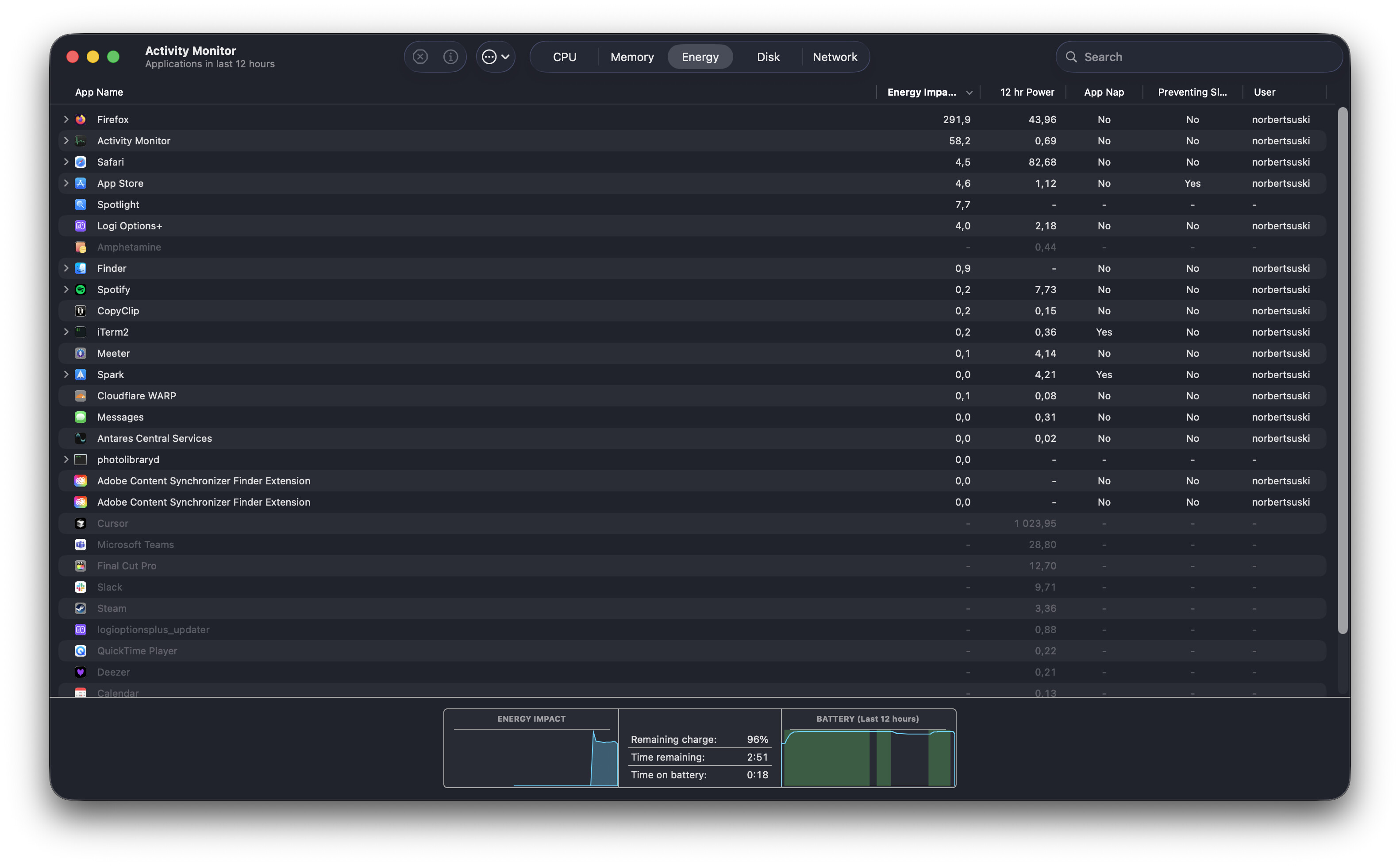 Activity Monitor screenshot (Cursor seems to be disabled, but it’s still displayed in “Usingi Significant Energy”)