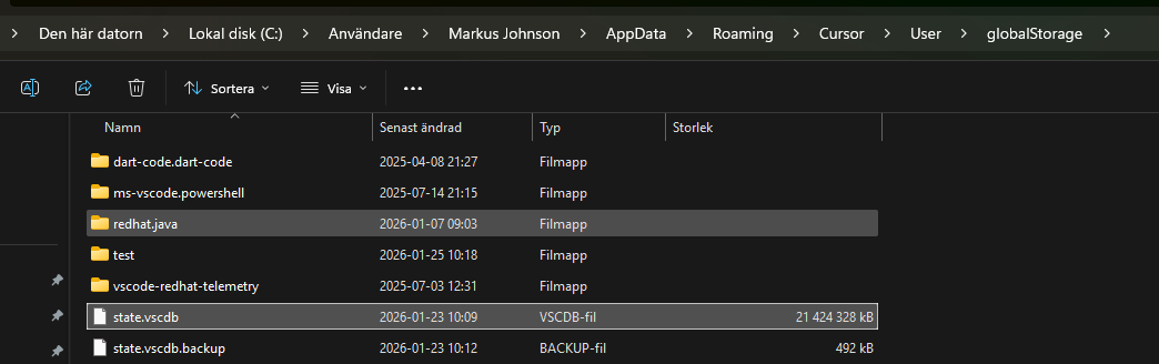 Hey, thanks for the screenshot. I can see the issue. Your state.vscdb is 21 GB, which is abnormally large. A normal Cursor database is usually a few hundred MB, not gigabytes. That’s a clear sign of corruption.