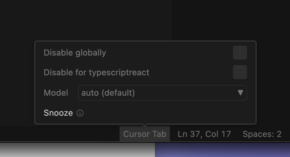 The Cursor Tab feature usually stops and shows “Disable globally,” and it doesn’t suggest any change.