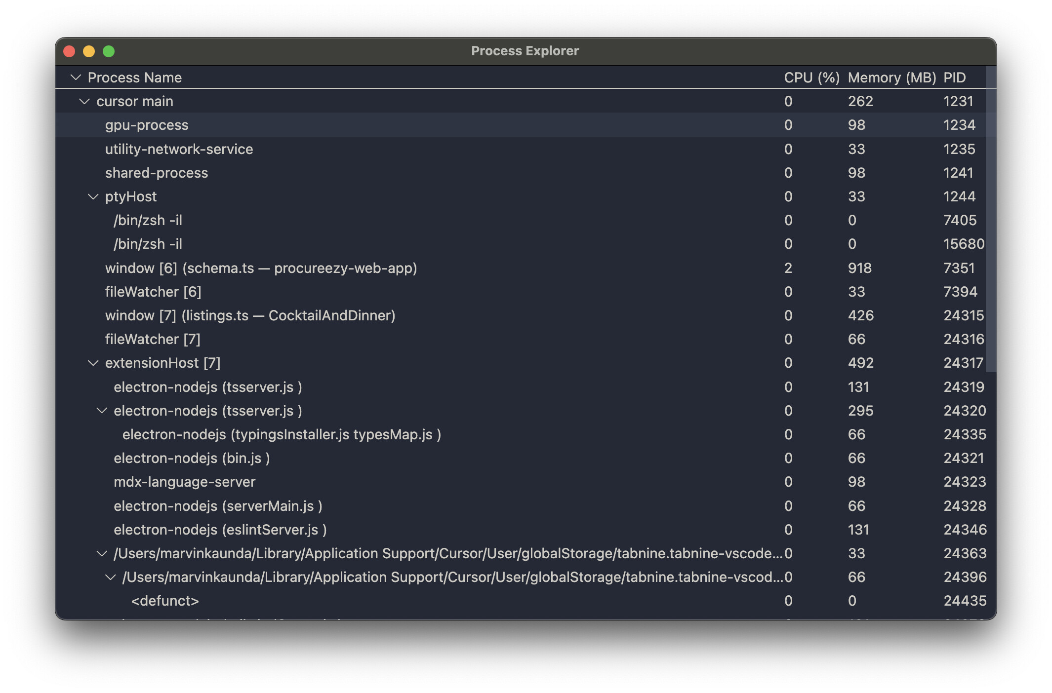Hey, this may not be a Cursor problem at all, perhaps a some-kind plugin, try opening “Open Process Explorer” in the editor (cmd + shift + p) and look there.