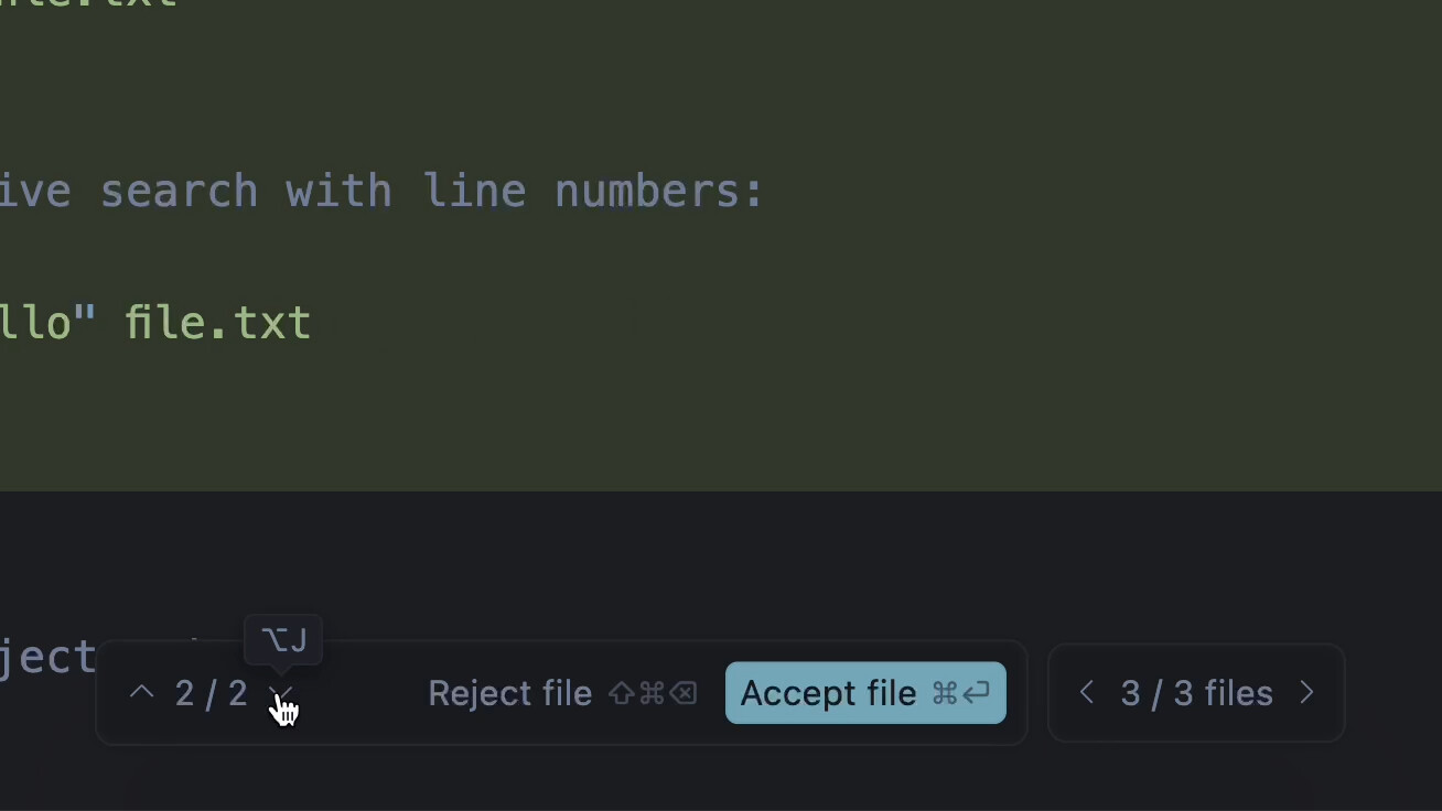 - A bottom panel will appear where you can accept or reject changes for the current file and move to the next file.