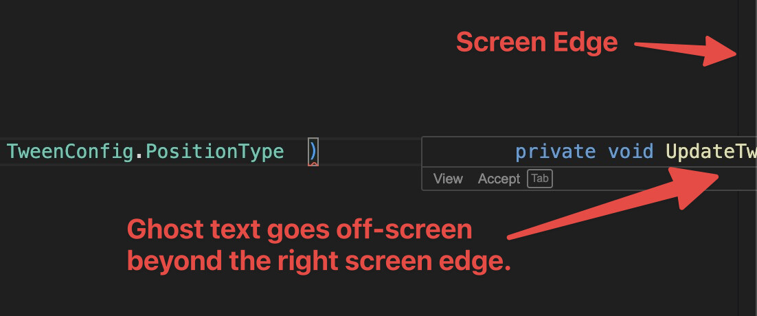 When typing with inline suggestions enabled, ghost text sometimes extends beyond the right edge of the editor window. The suggestion is rendered outside the visible area, making part of it impossible to see.