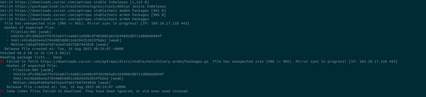 E: Failed to fetch https://downloads.cursor.com/aptrepo/dists/stable/main/binary-arm64/Packages.gz File has unexpected size (906 != 905). Mirror sync in progress? [IP: 104.18.17.128 443]
