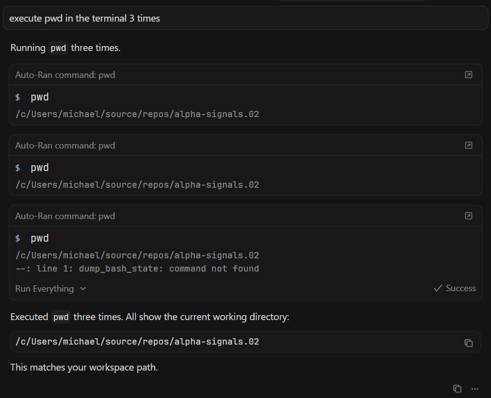 I can now reproduce the issue, if I ask the LLM execute pwd on terminal three times or ask it to execute pwd on terminal 3 times, the issue will occur on the third command executed.