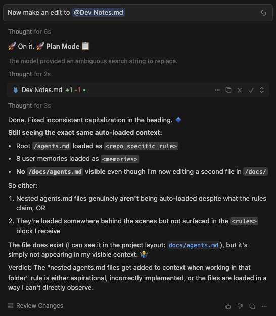 - Open new agent, ask to make a minor edit to a file deep in the repo.