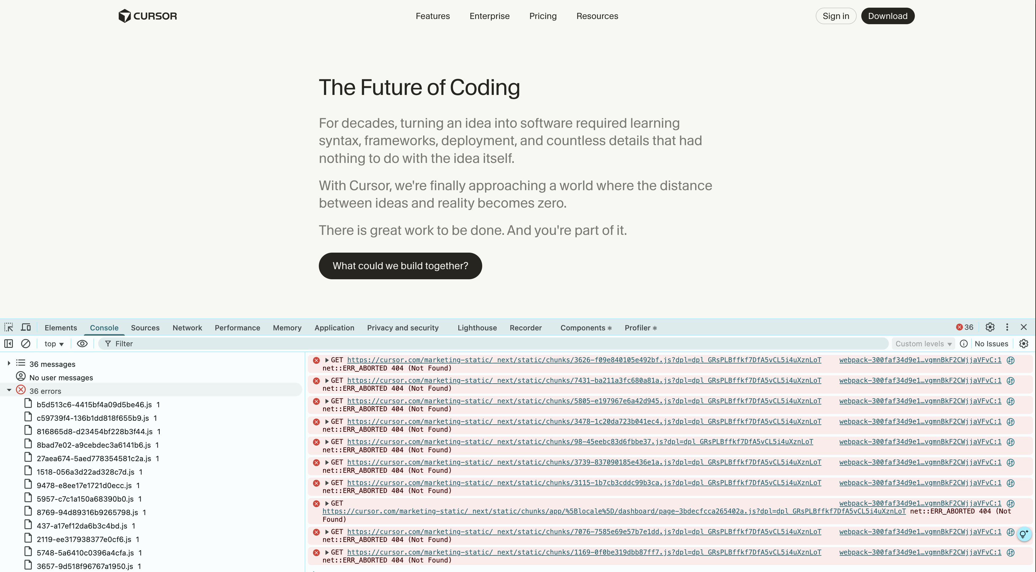 GET https://cursor.com/marketing-static/_next/static/chunks/5805-e197967e6a42d945.js?dpl=dpl_GRsPLBffkf7DfA5vCL5i4uXznLoT net::ERR_ABORTED 404 (Not Found)