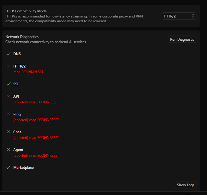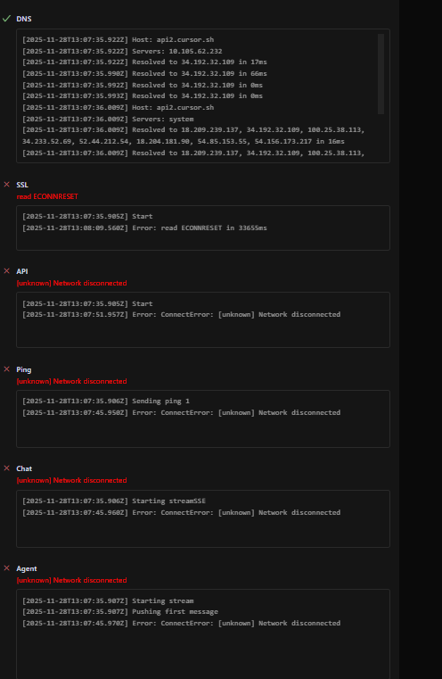 I am consistently getting ConnectError: [unknown] Network disconnected and read ECONNRESET errors when using Cursor AI chat. According to Network Diagnostics, api2.cursor.sh resolves correctly to multiple IPs (52.70.238.83 and others) with Result: true, but the connection is dropped after ~10–30 seconds during stream/streamSSE with ECONNRESET or ConnectError: [unknown] Network disconnected. DNS is set to Google DNS (8.8.8.8/8.8.4.4), HTTP/2 is disabled, VPN/proxy is disabled, firewall allows Cursor, and cursor.com opens fine in browser.