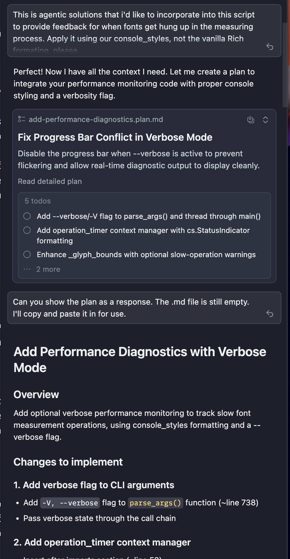 Agent should be printing plan to .md file. It might be printing to cached or deleted .md file or some other in-between method, but it’s not printing to .md file it created.