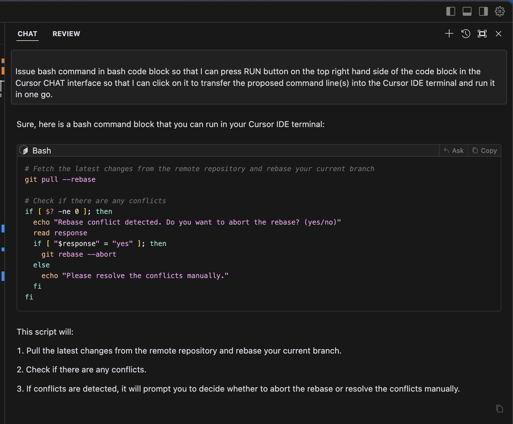 Issue bash command in bash code block so that I can press RUN button on the top right hand side of the code block in the Cursor CHAT interface so that I can click on it to transfer the proposed command line(s) into the Cursor IDE terminal and run it in one go.