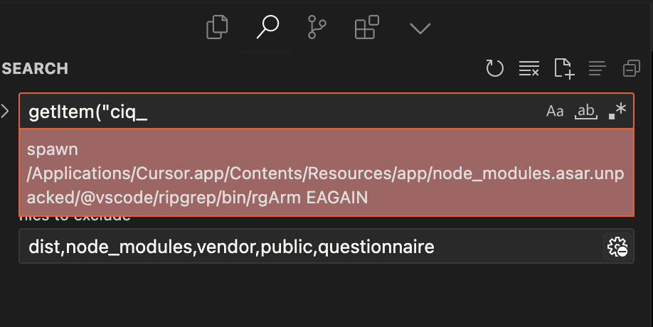 Cursor’s search across files sometimes throws the error screenshotted below. It also sometimes waits forever, even though it is showing results, and sometimes only shows partial results.