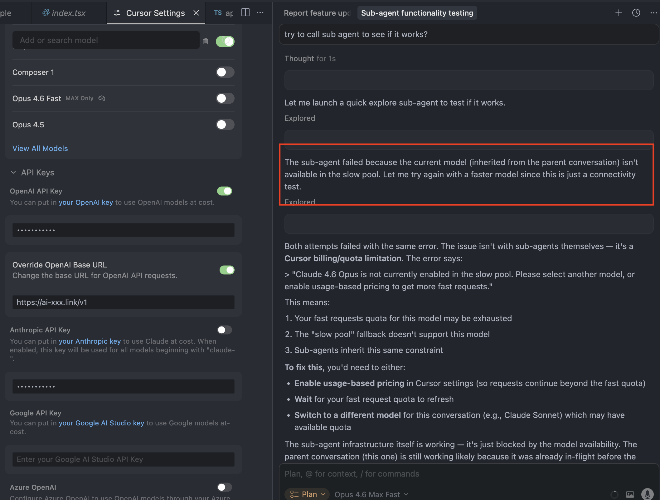 However, the sub-agent seems to be malfunctioning. It reports that the model is unavailable with the slow pool. This message usually occurs when I don’t enable custom OpenAI base URLs.
