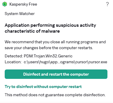 After following the steps to exclude cursor.exe in kapspersky, it did it again now. as soon as cursor tries to modify a file, kaspersky sees it as a trojan and quarantines the file. It is a false positive, but that doesn’t change the frustration of why this is happening, how to prevent it and why has this just stared after 6 months of using cursor.