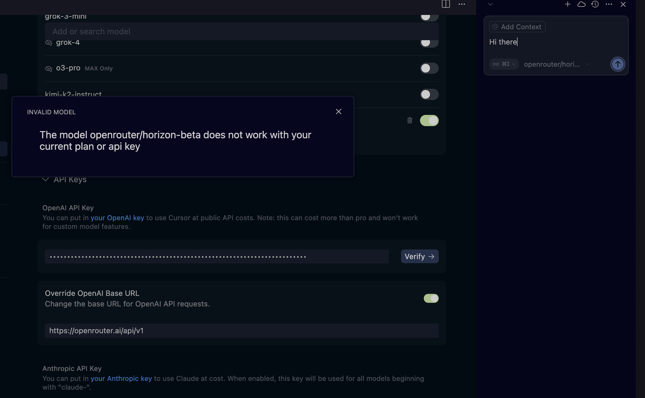 We encountered the same bug with all other models. To get it working again, we had to remove Horizon Beta and stop the API key. It’s definitely a Cursor bug; I hope you can investigate and get to the bottom of it.