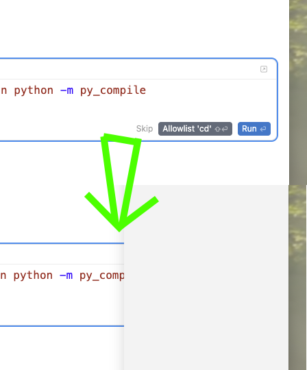 When working with the Agent in “Editor” mode (i.e. the chat panel docked on the right) one is often prompted to Run commands (in addition to “Skip” and “Allowlist ‘${cmd}’” options). If the mouse enters the cursor window from the right side (because the editor is not full-screen and you have another window to the right of Cursor, perhaps even the application you’re working on), as soon as the mouse cursor crosses into Cursor the Agent selection window pops out and covers the buttons you are intending to click, so you need to do extra work to make the Agents flyout go away and hope that you are young and with fine motor skills such that you don’t accidentally cause it to pop out again as you try to get back to click on these buttons.