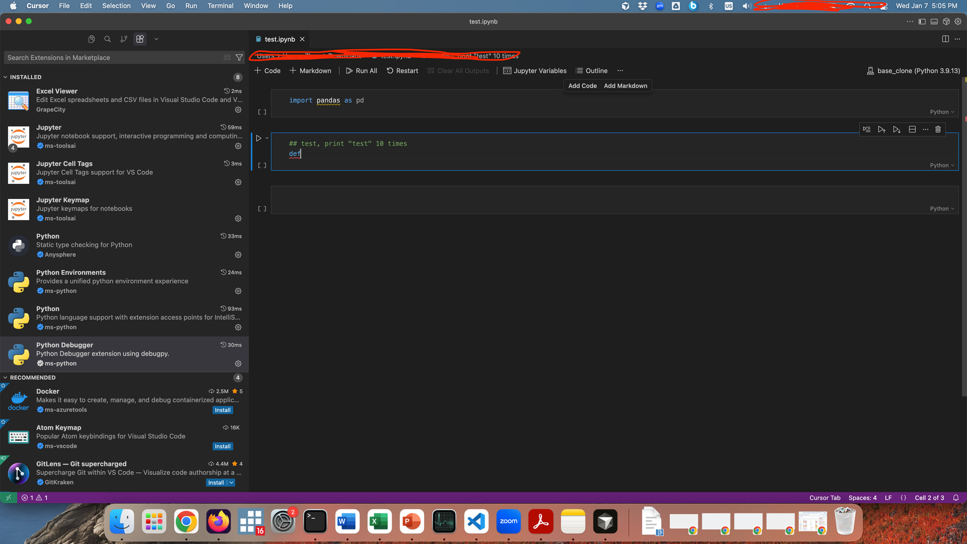 But not in .ipynb file. See screenshots. Tried multiple times, no matter I write an import line or simply prompt a function via a comment in a Notebook cell, it does not provide any autocompleting suggestions. Tried reinstall Cursor, clear cache, and reinstall Jupyter extesions.